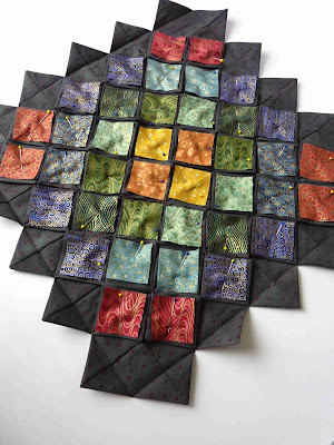 | Secret Garden block during sewing. The block starts in a similar way to Cathedral Window but the “windows” are put in a different place. |