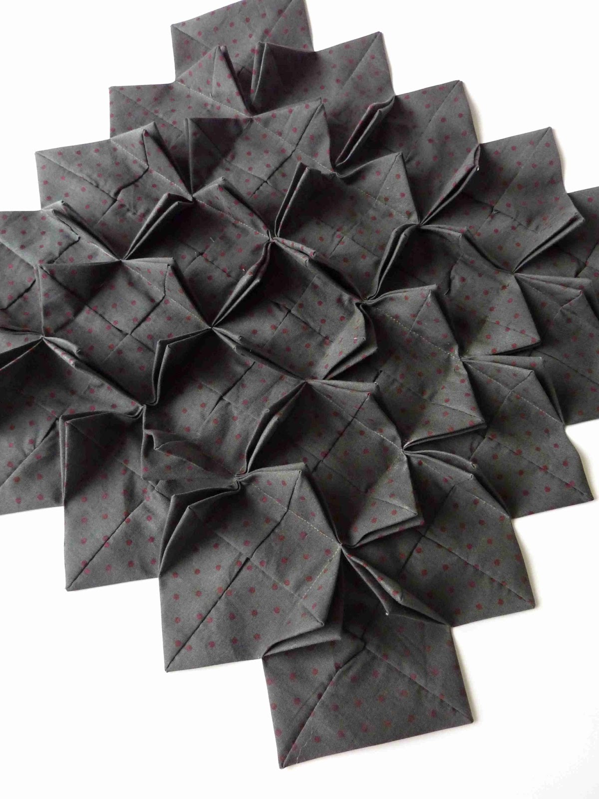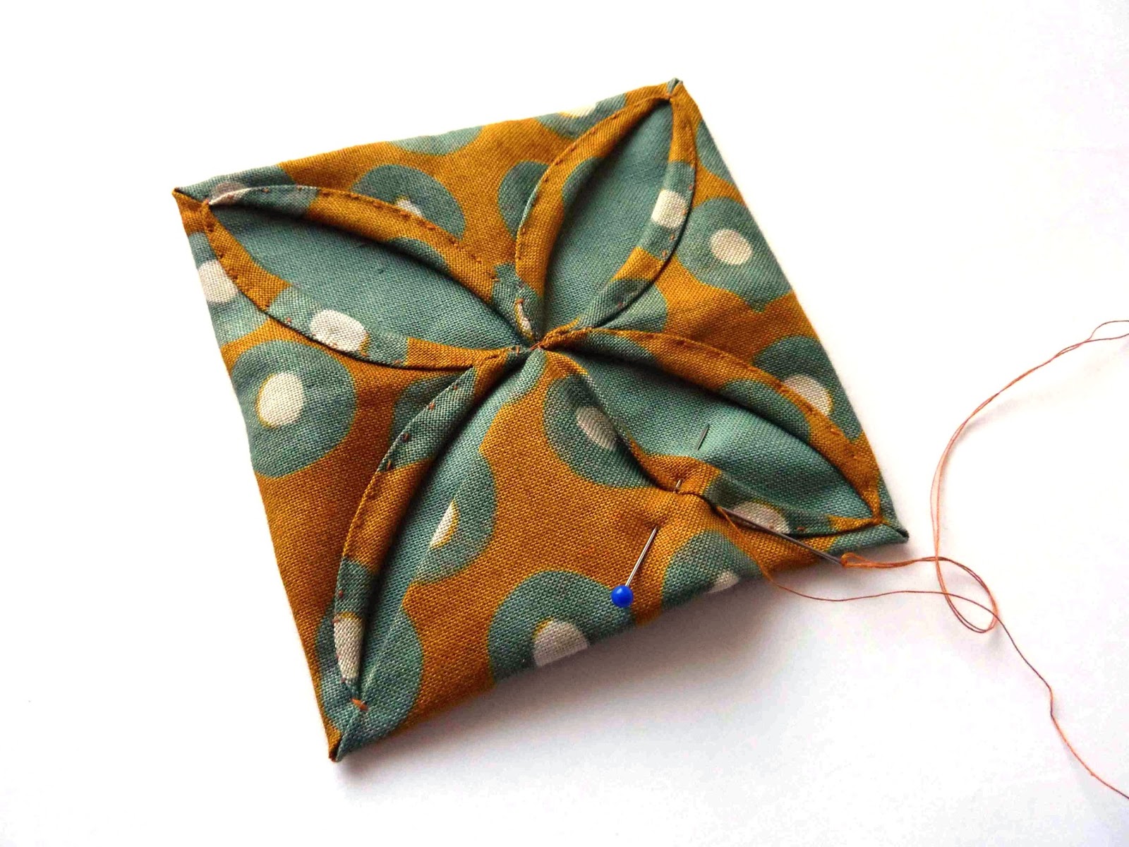 | Secret Garden block during sewing. The block starts in a similar way to Cathedral Window but the “windows” are put in a different place. |