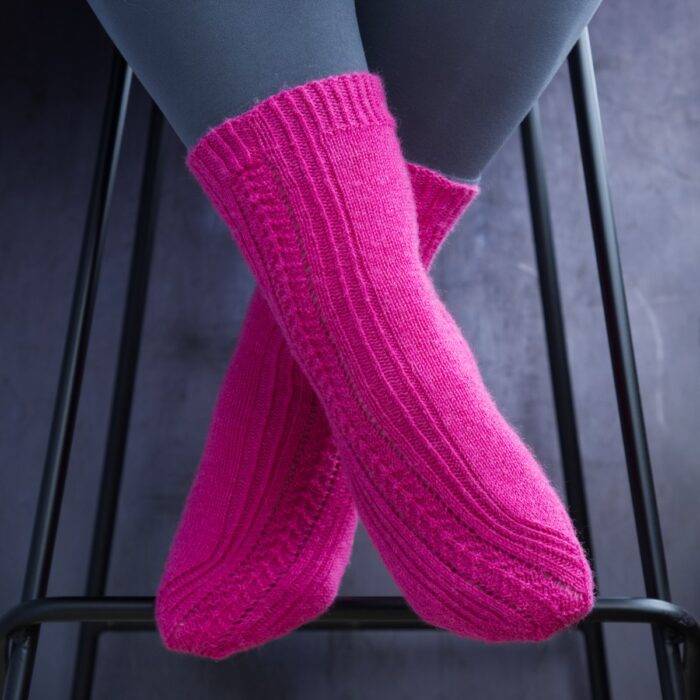 The Cembra socks are a simple yet elegant sock pattern. The chevron texture is inspired by the pine cone of the alpine pine tree, Pinus Cembra. The simple-to-work chevron on each sock is followed by a swathe of relaxing stocking stitch. The socks are mirror images of each other.
