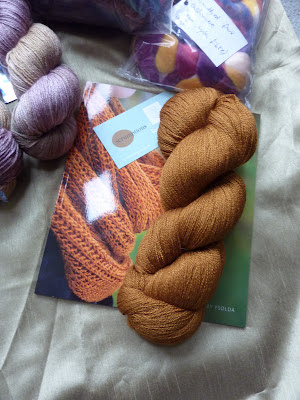 - The beige, purple and burnt orange are all baby camel and silk mix in sockweight which is super soft and squidgy from Yarnaddict and I want to make a Colour Affection with them
